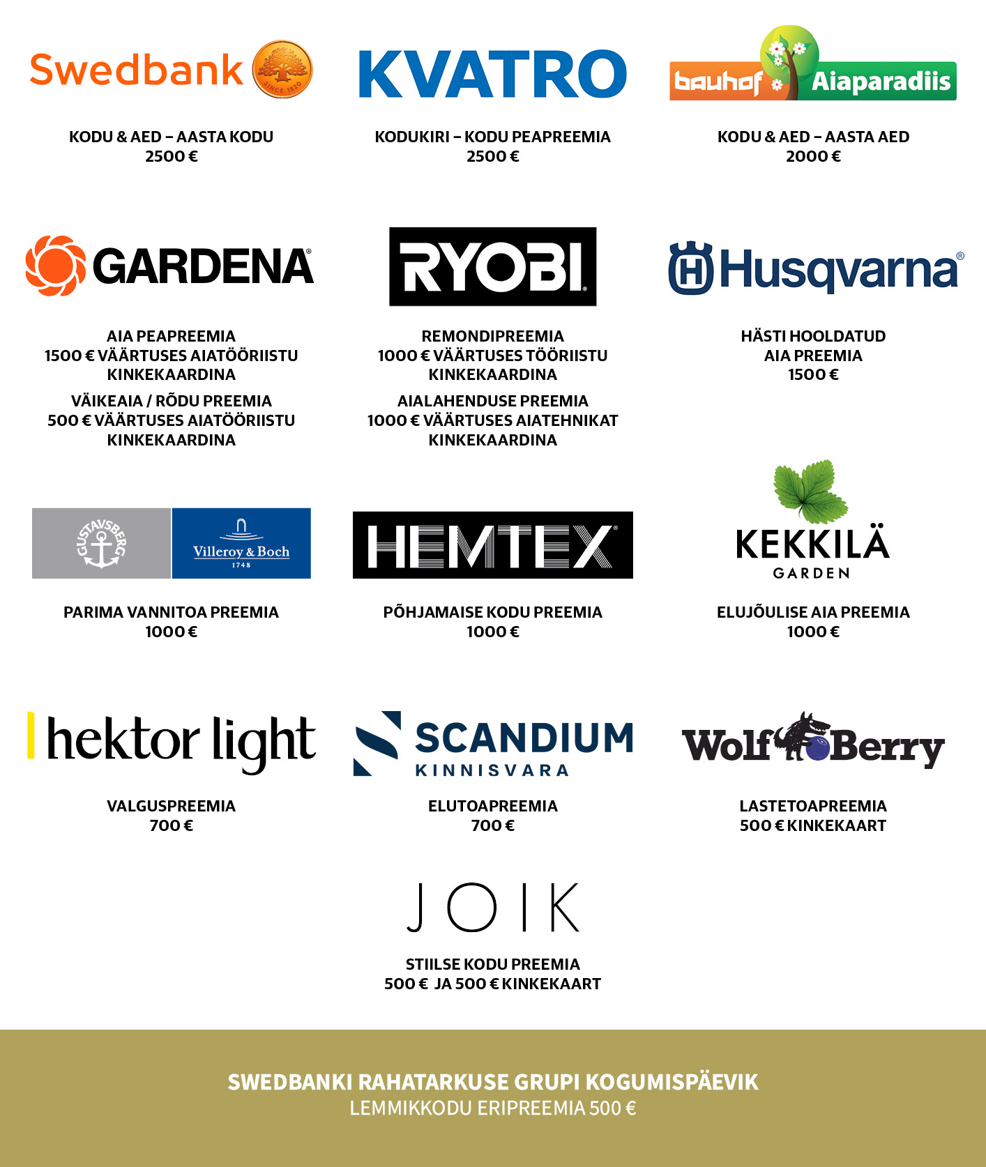 *Kinkekaartidena välja toodud preemiad saab võitja lunastada ettevõtte toodetes. Summana välja toodud preemiatest arvutatakse maha tulumaks ning kantakse võitja antud pangakontole.