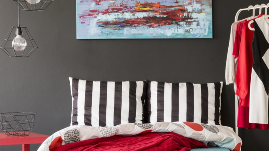 Omapärane ja julge magamistuba. Tumehalli seina taustal tulevad kõik kirkad värvid hästi esile, eriti põnevalt mõjub punane. Selle magamistoa kujundusvõti on kaunis maal, millest lähtuvalt on valitud ka teised värvitoonid.