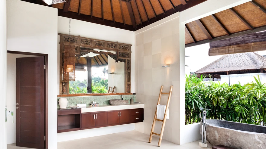 Askeetliku joonega vannituba Balil - kivi ja puit heas kombinatsioonis. | foto: ShutterstockÕues sajab, aga tahaksid, et kodus püsiks selline mõnus olemine, mis ei lase päikest südamest kaduda - miks mitte ammutada sisustusideid paradiisisaarelt Balilt? Ideid ja meenutusi jagab blogi Home for Soul autor Katariina Kalda.