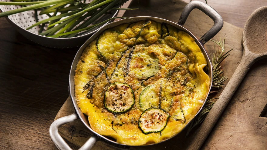 5. Kui pann on parajalt kuum, kalla segu pannile. Peale aseta suvikõrvitsad. Küpseta ahjus 10-15 min.