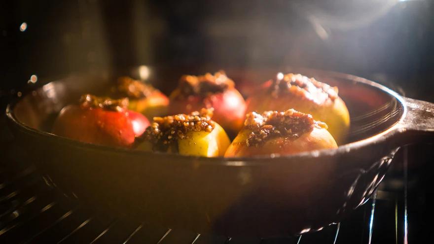Uurista õuntest südamikud välja. Sega kokku või, kaneel ja fariinisuhkur ja täida õunad seguga.