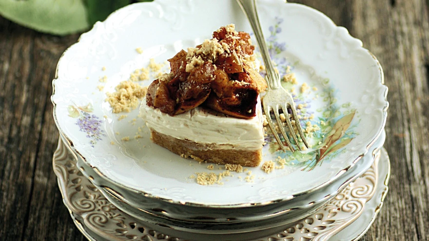 Kook, mis sobib sügist tervitama. | foto: Sille VadiAhjuõunakattega halvaamaiguline toorjuustukook ei vaja küpsetamist ega želatiini, vaid ainult piisavalt aega tahenemiseks.