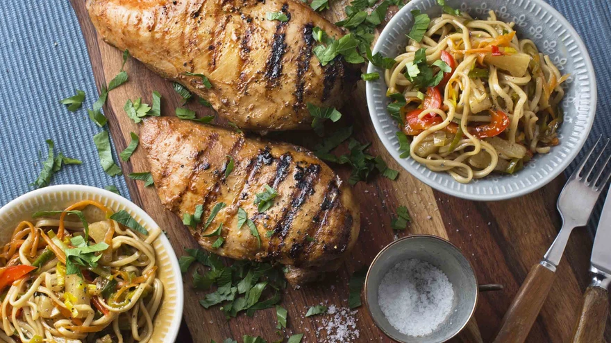 Viimaks lisa ananassitükid ja varem keedetud munanuudlid, kuumuta veel kord läbi. Vajadusel maitsesta. Puista üle hakitud lehtpeterselliga ja serveeri koos grillitud kanafileega.