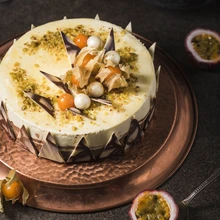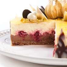 Passioni-toorjuustu kirg, mille täiusliku maitse tagavad šokolaadi-mousse, passioni-toorjuustu kreem ja mahlased vaarikad