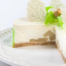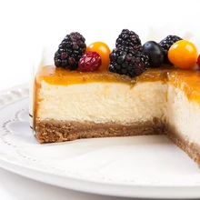 Toorjuustu-muraka hõrgutis on kaetud magusa murakamoosiga, mis seisab hõrgul küpsisepõhjal Manhattani toorjuustutordi peal