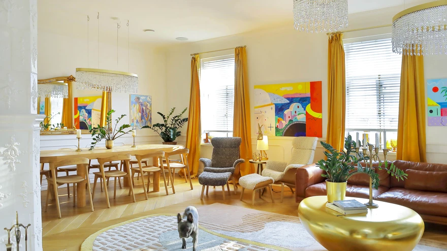 Kadrioru pargiserval peituv tõeline pärl püüab pilku oma uhkete värvide ning paljude põnevate detailidega lahendustega. Elutoas on rohkelt kunsti, sooja kullatooni, kahhelplaatidega ahi, värvirõõmu, kaunid kangad ja vormid. Diivanid ja tugitoolid on kutsuvalt valmis toredateks kohtumisteks ning vestlusteks.