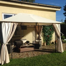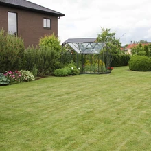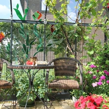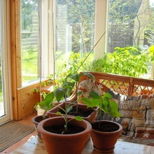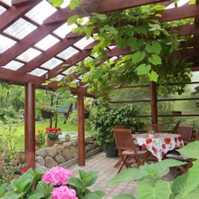 "Meie aeda mahub laud kahe tooliga, kus on õdus olemine tuulistel ja vihmastel päevadel. Kui seltskond on suurem, pakub mõnusat olemist terass," kirjutab ta. "Klaaskasvuhoones kasvavad tomatid, kurgid, lilled ja viinamarjad."