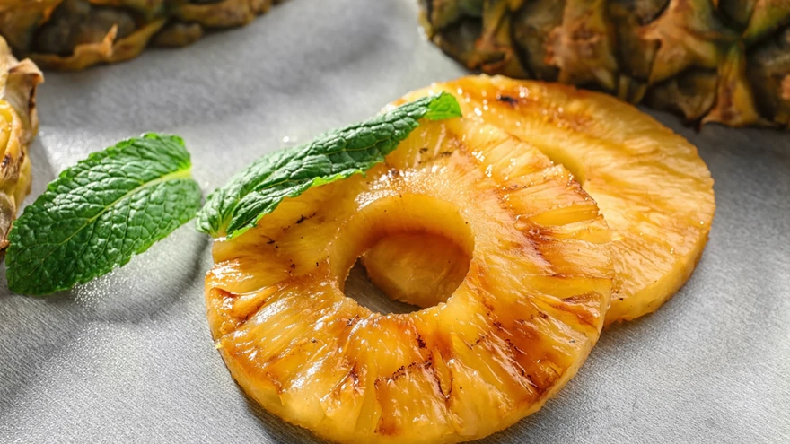 4. Pane ananassilõigud õliga määritud grillrestile ning küpseta umbes 10 minutit aeg-ajalt pöörates, kuni vili on kergelt karamellistunud.