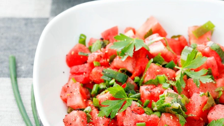 Rohkete ürtidega maitsestatud värskendav arbuusisalat sobib hästi erinevate grillitud lihade kõrvale.