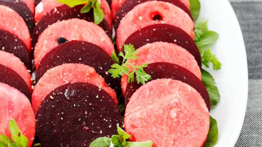 Laota rohelised salatilehed serveerimisalusele. Lõika peet viiludeks või kuubikuteks, tee sama arbuusiga. Laota vaagnale. Maitsesta vähese soola ja valge pipraga ning serveeri.