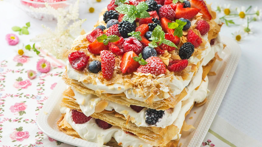 | foto: Jaan HeinmaaSee kook on tõeline suvehitt, milles säravad nii värsked marjad kui ka krõbe tainas. Filotainast mandlilaastudega põhja küpsetamine läheb õige lihtsalt. Rikkalik mascarpone-vaht ja suvised marjad moodustavad imemaitsva koosluse.