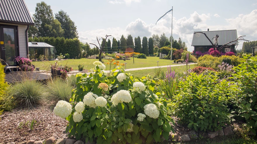 Aasta kodu 2024 "Aialahenduse preemia" saanud kaunis majapidamine. | foto: Meeli TulikOjaääre talu iluaed lausa särab südasuvises päikeses, mis paitab värvikaid lillevälju ja helgib tagasi tiikidelt.