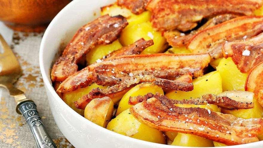 3. Küpseta 200-kraadises ahjus umbes tund aega, kuni kartulid on küpsed ja peekon kenasti läbi küpsenud.