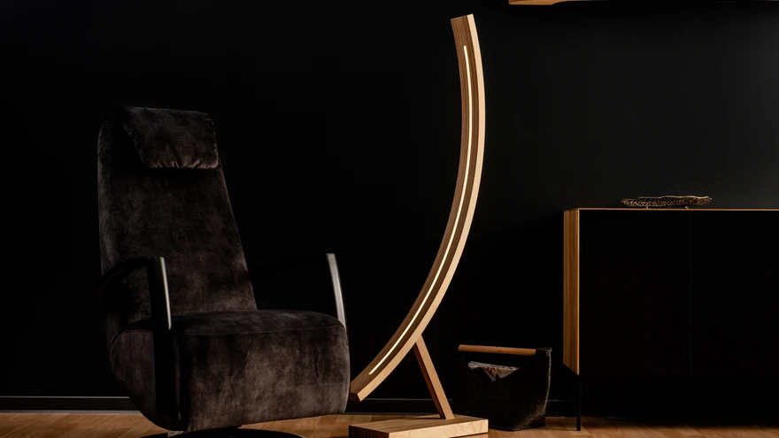 Käsitöö täispuidust põrandalamp MOODLIFTER valgustab kahte suunda.