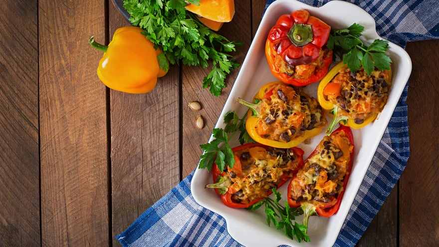 Lao paprikad ahjuvormi, puist peale riivjuust ja küpseta 200-kraadises ahjus umbes 30 minutit, kuni juust on pealt kuldpruun.