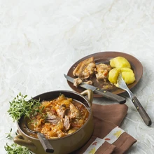 Eemalda liha kontidelt, lõika tükkideks ja tõsta hautisse tagasi. Serveeri keedukartulitega.