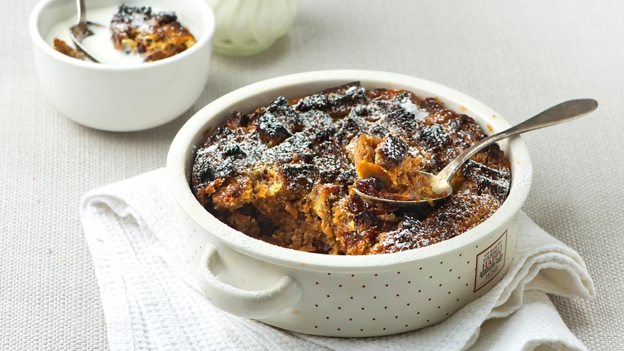 Kuumuta ahi 180 kraadini. Lõika leib väikesteks kuubikuteks ja pruunista pannil võis koos 2 sl suhkruga kergelt pruuniks, aga mitte väga krõbedaks. Sega hulka kaneel. Sega leivatükid rosinate või jõhvikatega ning tõsta kihiti õunamoosiga võiga määritud ahjuvormi.