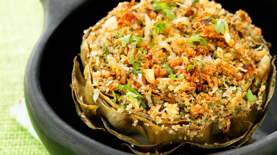 Aseta veidi jahtunud artišokid ahjuvormi üksteise kõrvale. Täida iga artišokk riivsaiaseguga, samuti proovi täidist sokutada lehtede vahele. Puista igale artišokile supilusikatäis parmesani.