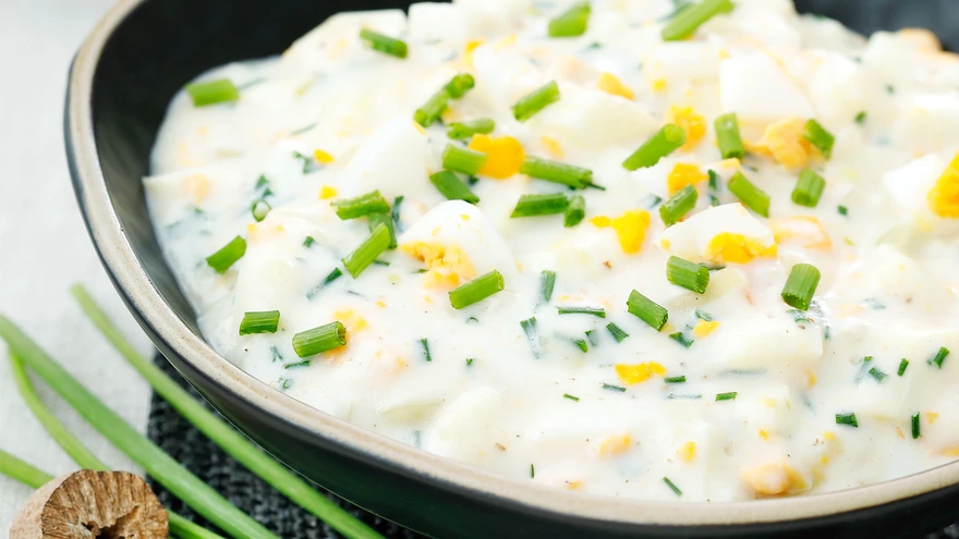 Lihtne jahukaste, millele on lisatud murulauku ja hakitud keedetud muna. Paku näiteks kalapallide ja/või keedetud kartulite kõrvale.