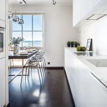 Hele ja minimalistlik köögimööbel on pärit salongist Schmidt ja valminud sisearhitektide jooniste järgi. Tööpindade ja seinapaneelide juures kasutatud marmorit imiteeriv materjal Dekton on eriliselt tugev, kriimustus-, määrdumis- ja kuumuskindel, mis ei näita kulumise märke ka aastate pärast.