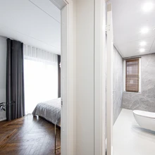 „Pere kasvades suureneb ka privaatsuse vajadus. Suuremates korterites oleme sisse toonud eramuliku lahenduse, kus peamagamistuba moodustab eraldi tsooni koos oma sissejalutatava garderoobi ja väikse vannitoaga ega paikne kohe laste tubadega kõrvuti,” ütleb Kesk-Peerti kodukvartali arendaja Triple Net Capitali projektijuht Martin Lember.