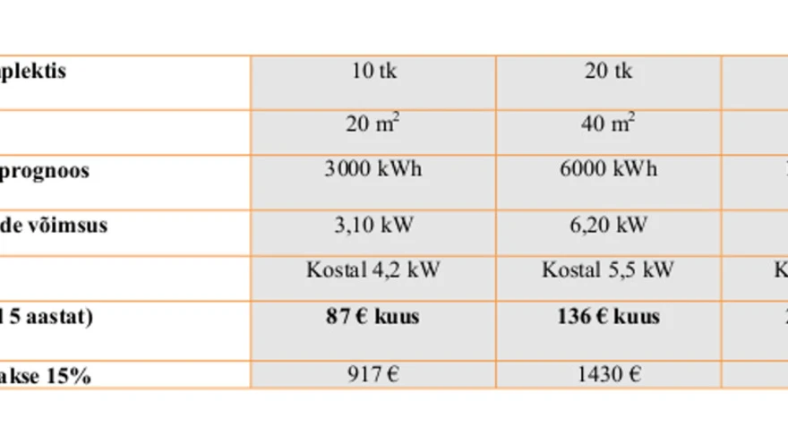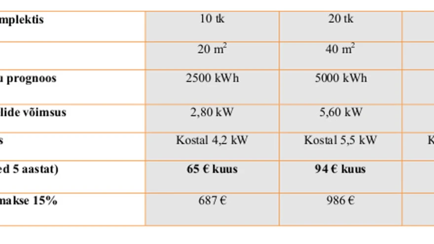 - Komplekti võimsus tähistab päikesepaneelide osa võimsust. Inverterite võimsused on vastavalt 4,2 kW 10 paneeliga komplekti korral ja 5,5 kW 20 paneeliga komplekti korral. Value 34 paneeliga komplektil 8,5 kW ja Premium 34 paneeliga komplekti korral 10 kW.