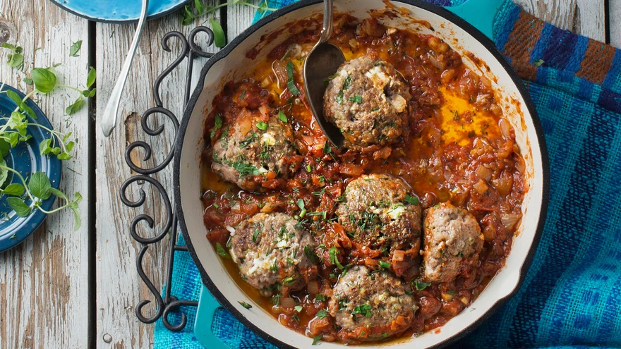 Sega hakkliha soola, pipra ja riivsaiaga ning lisa pisikesteks kuubikuteks lõigatud feta. Vormi saadud tainast kuus kuni kaheksa suuremat pallikest. Pruunista need igalt poolt võis ja tõsta kastmesse. Hauta madalal kuumusel kaane all 5–10 minutit. Serveeri meelepärase lisandiga!