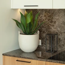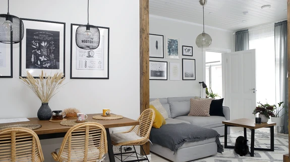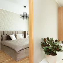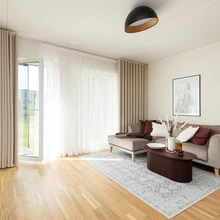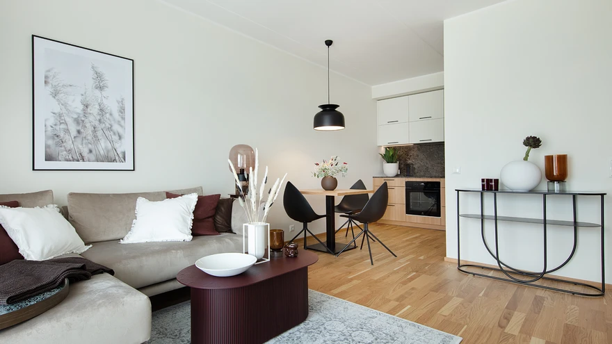 Koostöös kodumaise tootjaga Aunman valmis korterisse tammepuitu ja valgeid pindasid kombineeriv erimööbel, mis paneb rõhku kvaliteedile ja põhjamaiselt ajatule stiilile. Värviaktsendid on seevastu värskelt trenditeadlikud – punakas-pruunikas palett jälgib moekaid interjöörisuundi, mis näivad üha enam ruumikujunduses kanda kinnitavat. Ümarate vormidega sisustuselemendid – sisekujundaja lemmikud – jätkavad ajaga kaasas käivat moodsat joont. Kujundust läbivad Taani tootja Ferm Livingu kenad ja praktilised mööbliesemed, soojust ja pehmust lisavad omakorda tekstiilid ning tapeet magamistoas. Tavapärasest julgem ja erilisem on pruunides toonides köögimööbli lahendus.