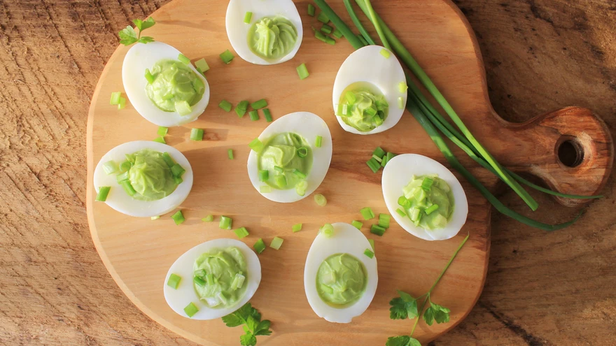 Koori munad ning lõika pikuti pooleks. Tõsta guacamole munakollase peale või eemalda kõigepealt rebud ja täida munad alles siis.