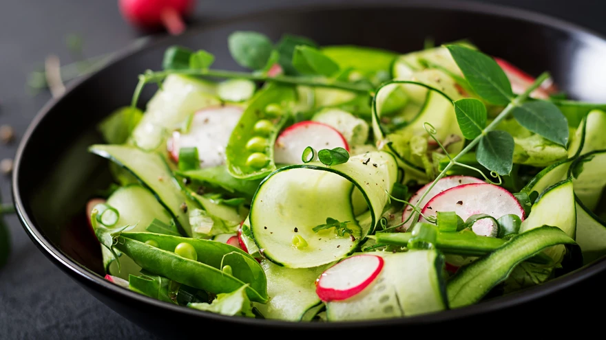 Koori redis ja soovi korral ka kurk. Lõika mõlemad pikkupidi pooleks ning höövelda saadud poolikust juustu- või juurviljakoorimisnoaga pikad laastud. Tõsta kaussi, maitsesta kergelt soolaga ja sega.