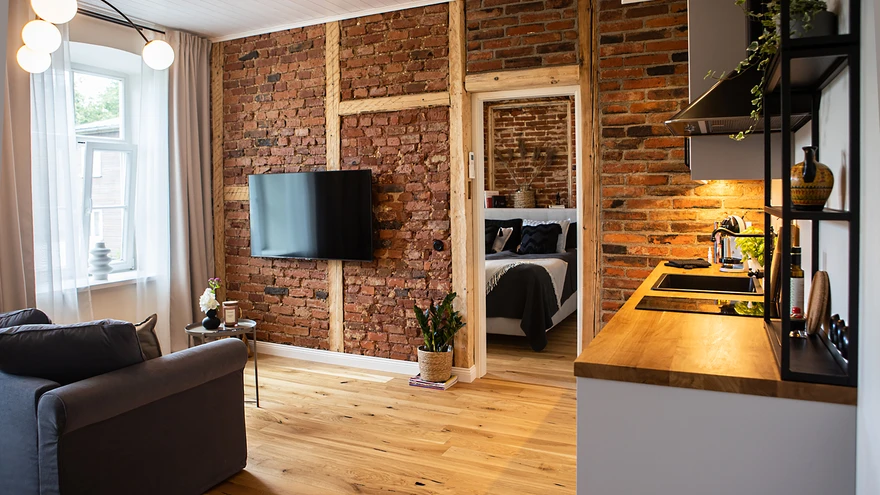 „Viljandit teatakse ka kui punaste telliste linna,” ütleb Triin Kruus, kes koos abikaasa Ahtoga lõi sinna 1870. aastal ehitatud punastest tellistest majja puhkamiskodu. Interjööris toodi esile sellest materjalist sein.