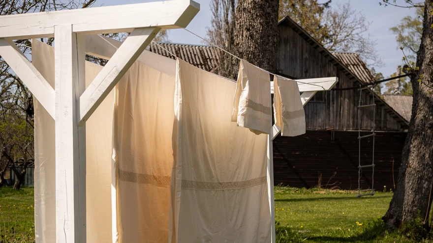 Skandinaavia-hõnguline pesukuivatusraam | foto: Älis HeinlehtNorras elades nägin, et paljudes hoovides on just sellised kahe posti vahele tõmmatud nööridega pesukuivatussüsteemid. Keskel jookseb lisaks veel kitsam pruss, millele on hea nt tekke ja vaipu kuivama panna. Muidugi tahtsin samasugust ka endale ja see idee loksus peas oma koju kolimisest saati. Lõpuks sai see tehtud!