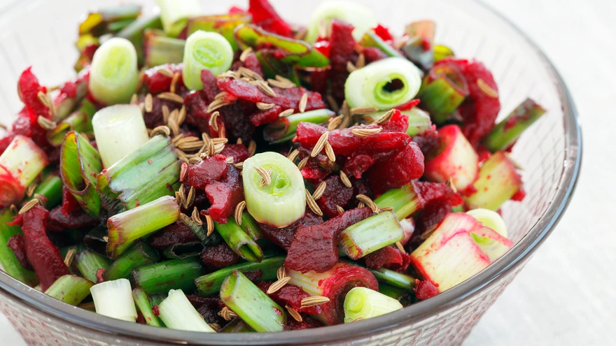 Pese sibulapealsed, tahenda ja lõika 1 cm tükkideks. Riivi peet. Sega toiduained, piserda peale jõhvikamahl ja maitsesta köömnete, soola ja suhkruga. Anna lauale kausiga, soovi korral paku kõrvale kastet.