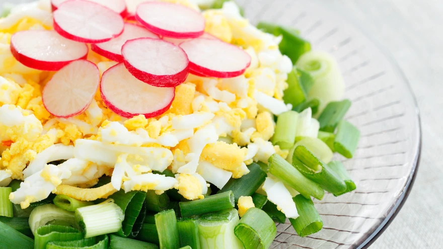Pese sibulapealsed, tahenda ja lõika 1 cm tükkideks. Puista peale hakitud muna ja tõsta salatikastet, aga ära läbi sega. Kaunista rediseviiludega.