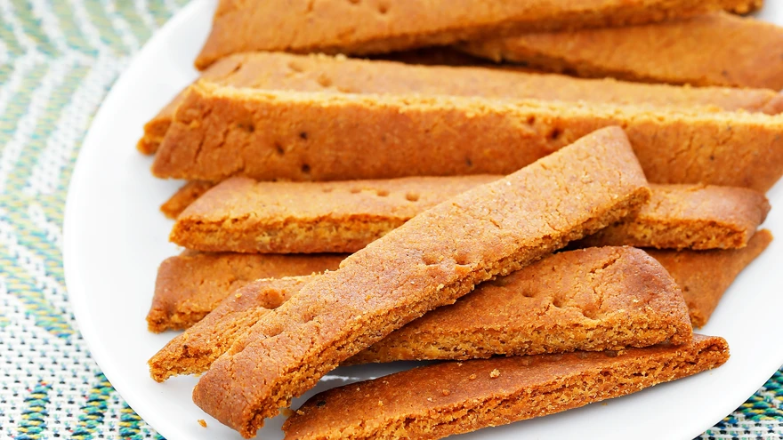 Jaota tainas kolmeks. Rulli või mätsi tainaosad ahjuplaadile asetatud küpsetuspaberil piklikeks õhukesteks plaatideks ja torka kahvliga kergelt läbi.
