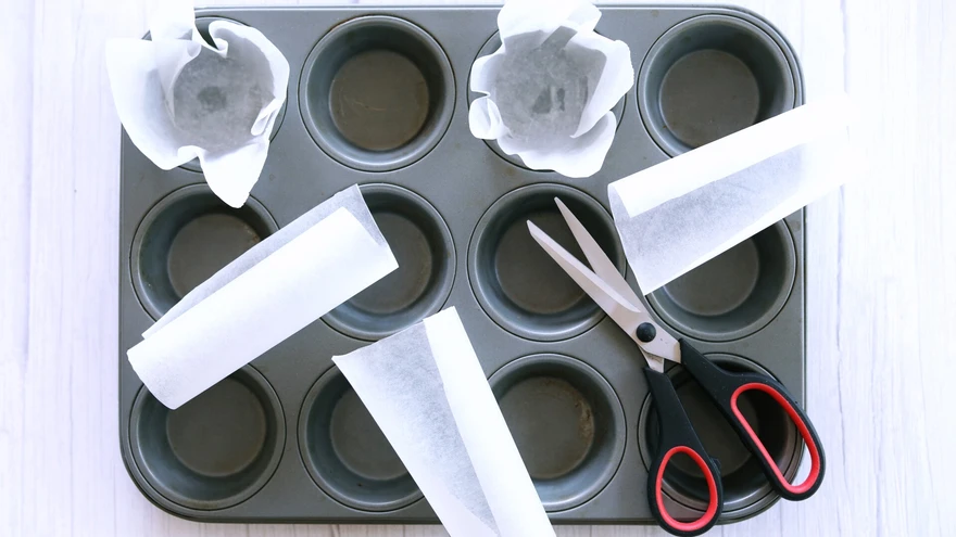 1. Lõika küpsetuspaberist tosin 12 × 12 cm ruutu ja voorderda nendega muffinipann. Et paber paremini vormis püsiks, võid selle alla killukese võid määrida.