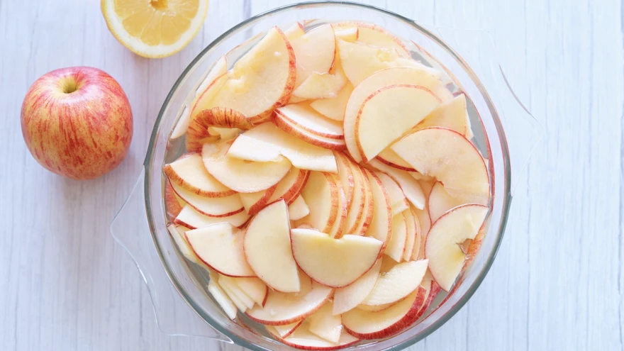 3. Pigista sidrunimahl veega täidetud kaussi ja pane lõigatud õunaviilud kohe vette, et need oma värvi ei kaotaks. Kuumuta sidrunivee ja õuntega kaussi mikrolaineahjus 3 minutit või vala vesi koos õuntega potti ja aja keema, keeda minut ning võta seejärel tulelt, jättes õunaviilud kuuma vette. See aitab õuntel pehmeneda, et neid oleks kergem roosiõielehtedeks painutada. Olenevalt õunasordist võib mikrolaineahjus selleks kauem aega minna.