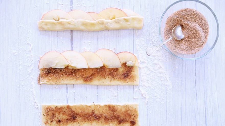 6. Pintselda tainaplaadid võiga ja puista peale kaneelisuhkrut. Laota õunaviilud tainaribade ülemisele äärele ja keera alumine riba õunte alumisele äärele. Pintselda õuntel olev tainariba sulavõiga.