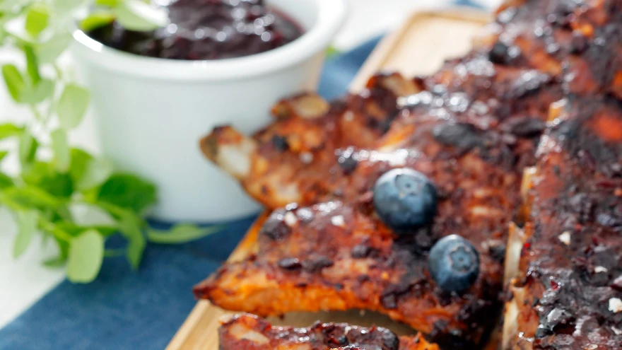 Pärast tunniajalist küpsetamist võta ribid ahjust välja ning pintselda mõlemalt poolt julgelt mustikakastmega. Pane ribid uuesti ahju, nüüd juba ilma fooliumita, ja küpseta veel 15–20 minutit. Pööra ribisid kastmes.