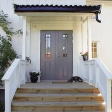 Kui lõheroosa või purpurne välisuks tundub liiga hulljulge mõte, siis jäta uksetoon klassikaliselt tumedaks või heledaks ning panusta huvitavasse disaini, valides näiteks klaasinguga välisukse, mis loob mängulise ja stiilse üldmulje. Ka seal on erinevaid valikuid, näiteks udune satiinklaas või põnev mustriline klaas. Klaasinguga välisuksel on veel üks suur pluss – tänu ukseaknale on esik valgem ja tundub seetõttu avaram.