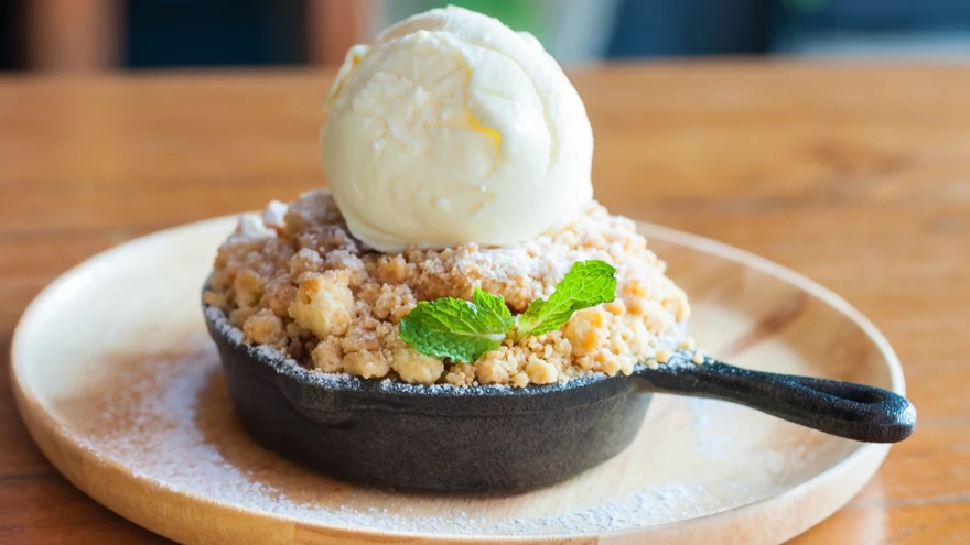 Kui sa toorjuustuvahtu ei viitsi teha, siis maitseb see hea ka jäätisega. | foto: ShutterstockÕunakrõbedik (ingl k apple crisp või apple crumble) on Suurbritannias ja USAs väga populaarne õunadessert, mida Eestiski võiks rohkem süüa – valmib see ju koogist kiiremini!