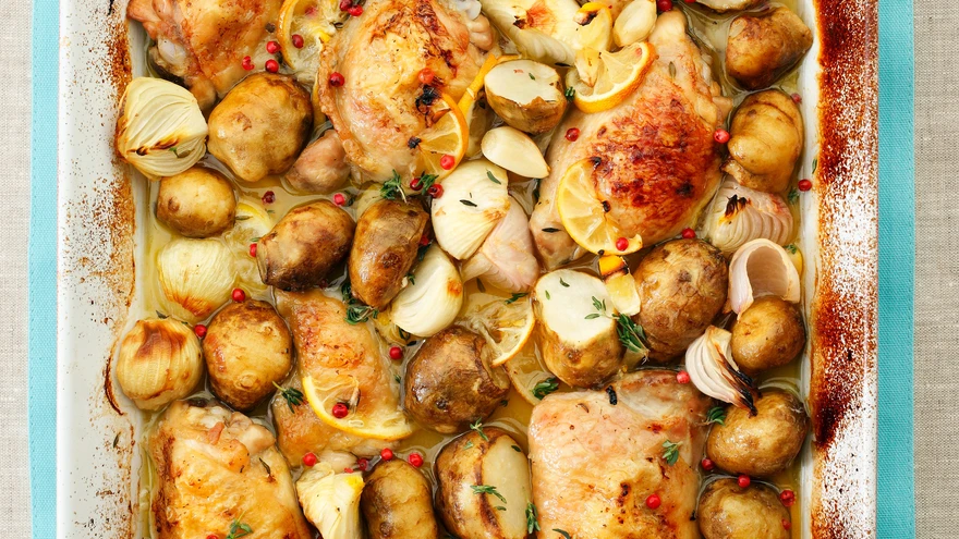 Võta kana ahjust välja, säti maapirnid, sibul, küüslauk ja sidrun kanatükkide ümber, maitsesta uuesti soola, pipra ja roseepiprateradega.