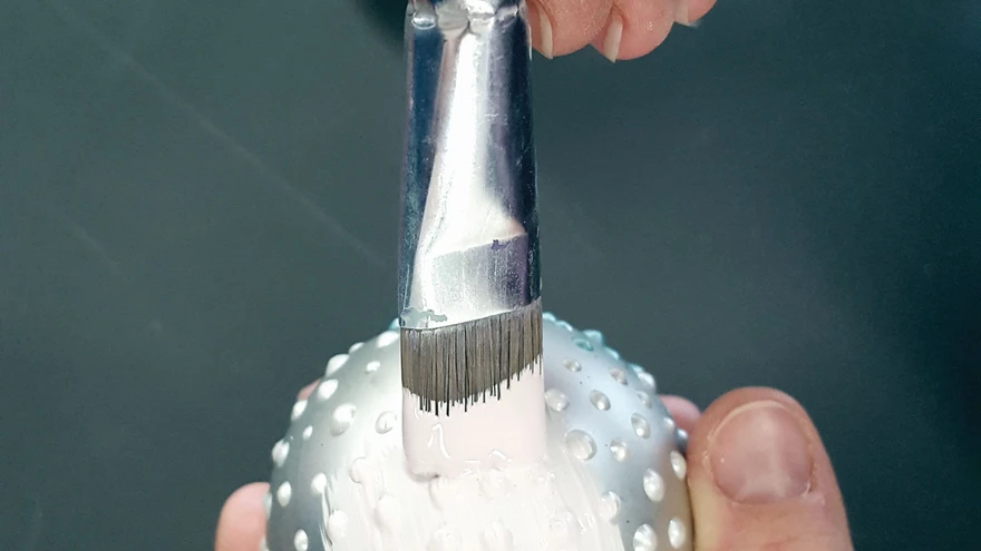Enne värvimist eemalda ettevaatlikult kuulikese riputusots ning pista ehe grillivarda otsa – nii saad selle hiljem mugavalt kuivama panna. Tõmba kaks korda üle pehme karvaga pintsliga, siis tuleb pind ühtlane ning ei jää pintslitõmbeid. Kui värv on kuivanud, võid vanutatud mulje jätmiseks ehte pinna kergelt lihvpaberiga üle käia.