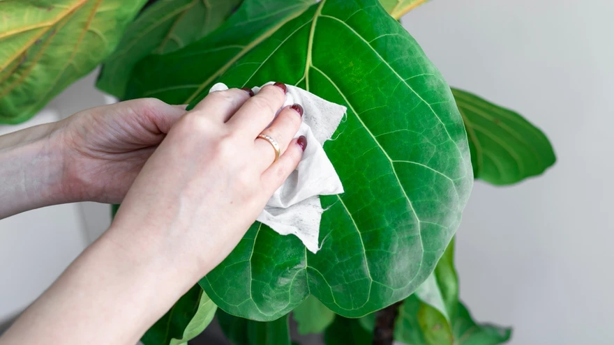 Lehtede puhastamiseks tasub vältida poest ostetud tööstuslikke puhastusvahendeid, mis võivad sisaldada taimedele kahjulikke aineid. Lihtne ja ohutu lahendus on kasutada leiget vett ning väga õrna seepi. Soovi korral võib lisada tilgakese looduslikku õli, mis annab lehtedele kerge läike, ilma et see ummistaks õhulõhesid. Selline puhastus aitab ühtlasi vähendada ka kahjurite levikut, sest tolmune lehepind loob neile soodsa keskkonna.