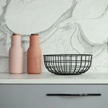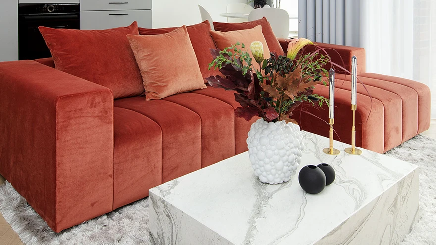 Marmori imitatsiooniga kivis ja messingust detailides on viiteid klassikale ja traditsioonide austamisele, samal ajal kui trendikas terrakotatoon lisab moekat nooruslikku joont. Ahvatlevalt sametise kattega voodi ja savikarva tekstiilid magamistoas mängivad kaasa Uus-Veerenni majadele omaste tellisfassaadidega. Elutuba on tänu maast laeni kõrguvatele akendele lausa lummavalt õhuline ja päikest täis.