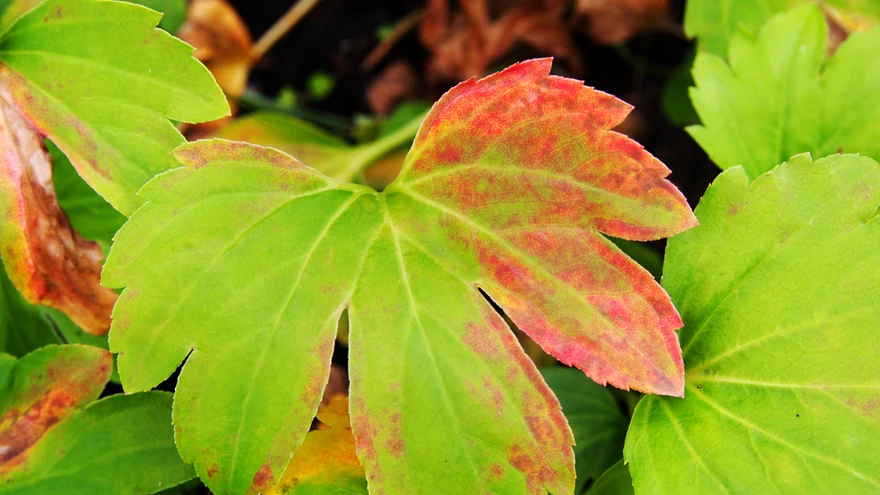 Pole palju püsikuid, kes end värvilise rüüga kaunistaksid. Rossi mukdeenia sort ’Karasuba’ värvub eredamalt kui põhiliik.