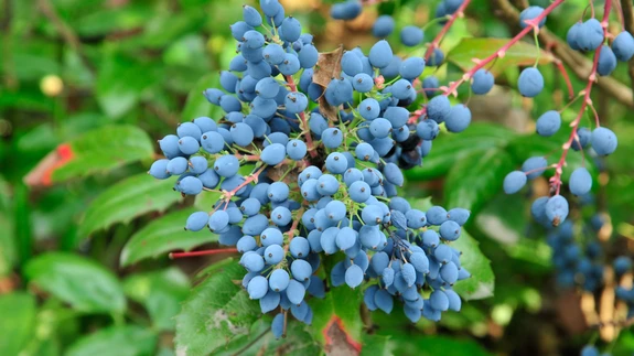 Läiklehise mahoonia Mahonia aquifolium marjad on väikesed ja hapud kui metsikul viinapuul....