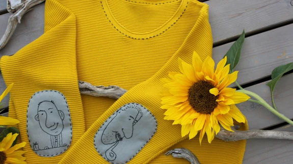 Ühtlaselt ühevärviline kudum saab hoopis uue ilme, kui lisada tikitud küünarnukitoed. Et tulemus oleks mehisem, võib ühele tikkida isa ja teisele vanaisa. Koomiksistiilis, lihtsate pistete ja nappide ...